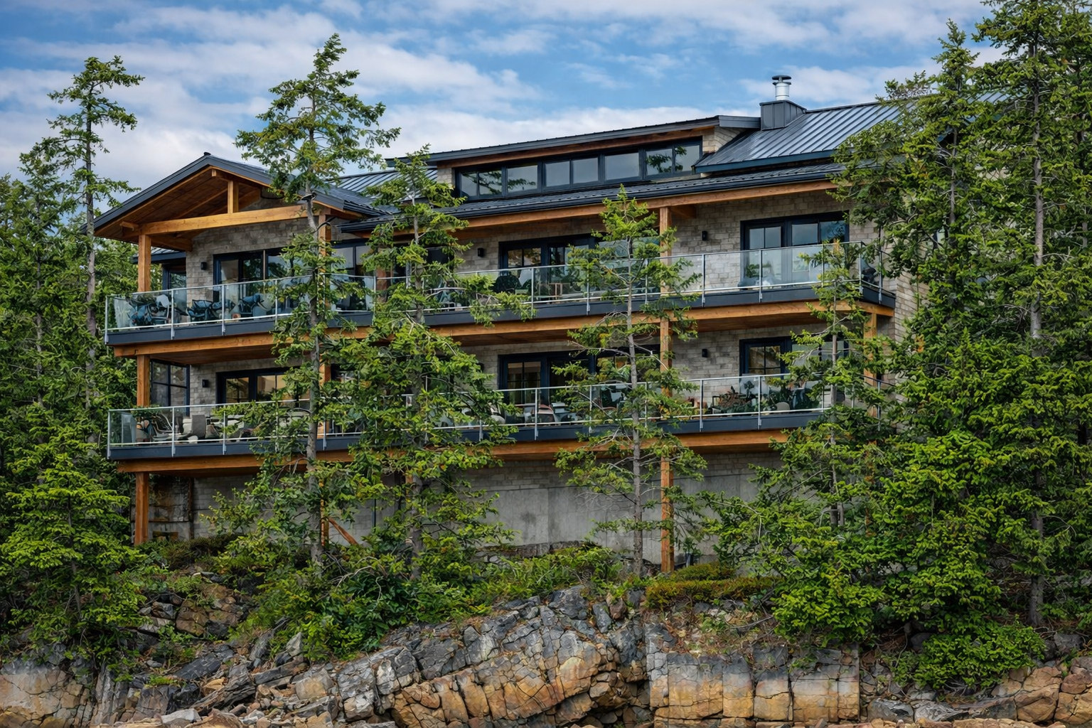 Designed for a protected cove location, this custom home responds to unique site conditions including cliff setting and marine exposure. Durable materials and elevated design protect against coastal weather while large windows and decks capture water views. The layout emphasizes seamless indoor-outdoor living.